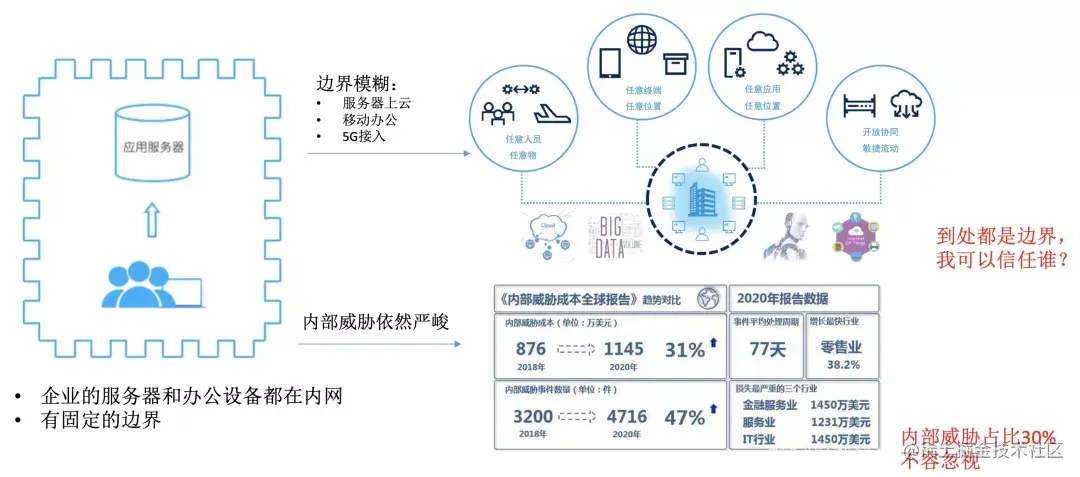 传统的网络安全架构理念是基于边界的安全架构,企业构建网络安全体系时,首先要做的是寻找安全边界,把网络划分为外网、内网等不同的区域,然后在边界上部署防火墙、入侵检测、WAF等产品。然而这种网络安全架构是基于内网比外网更安全的假设建立起来,在某种程度上预设了对内网中的人、设备和系统的信任,忽视加强内网安全措施。不法分子一旦突破企业的边界安全防护进入内网,会像进入无人之境,将带来严重的后果。此外,内部人员100%安全的假说也是不成立的,我们可以从《内部威胁成本全球报告》里看到,不管是内部威胁的数量,还是成本从2018年到2020年都有大幅的提升。