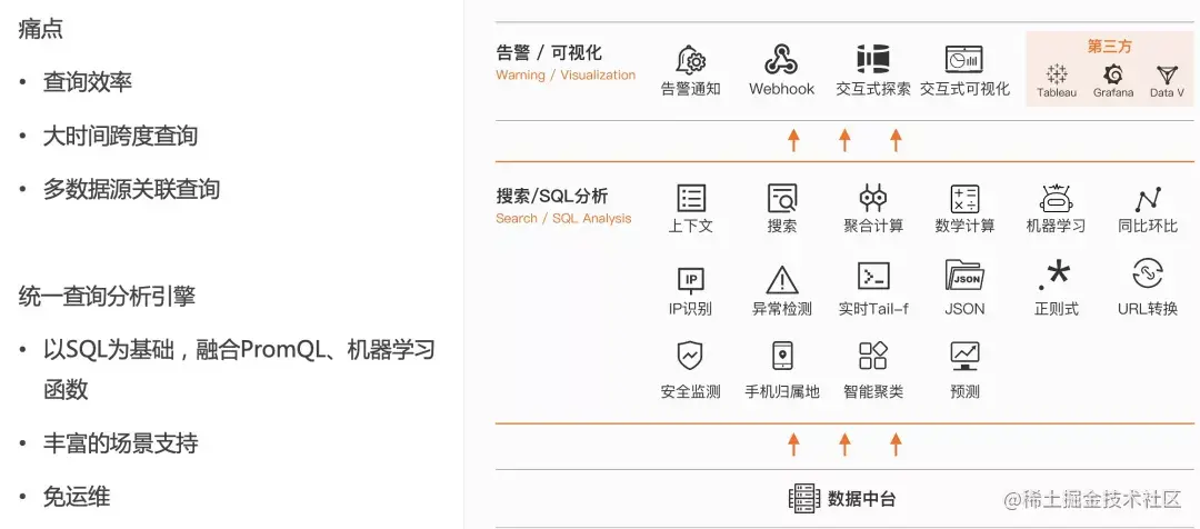 为了应对这些挑战,我们将日志、指标、Meta等数据全部接入到统一的存储中,在此之上,我们构建了一套统一的查询分析引擎,用于支撑查询分析、可视化、监控告警、AI 等上层能力。