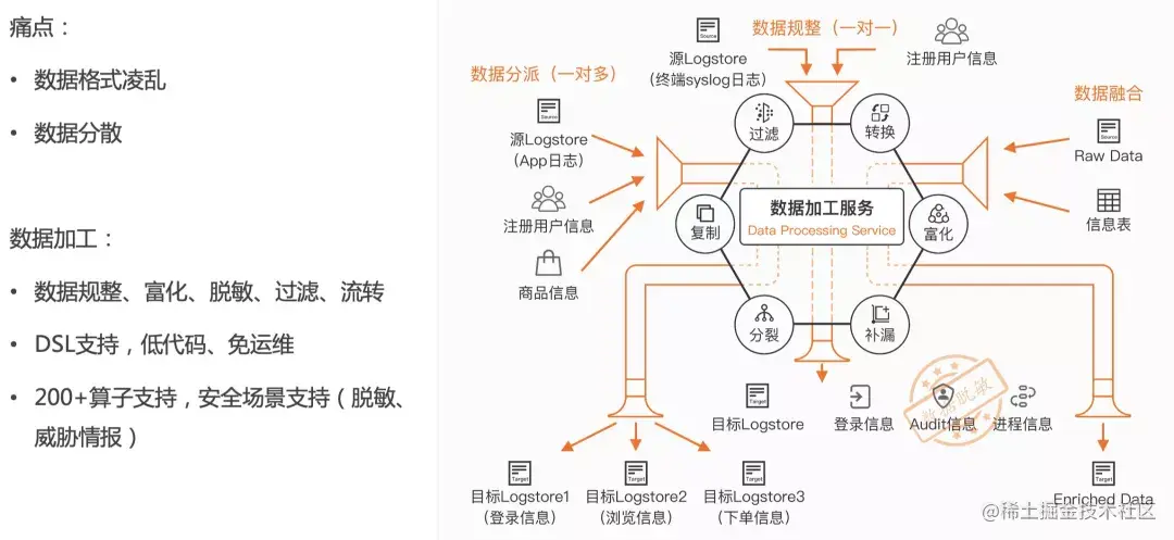 数据加工服务可以对结构化或非结构化的日志进行实时的ETL处理。该功能目前包含200+算子,广泛应用于数据规整、数据聚合、富化、分发等场景。对于安全场景,数据加工也有很好的安全类算子支持。例如,数据加工提供的数据脱敏算子,可以有效地减少敏感数据在加工、传输、使用等环节中的暴露,降低敏感数据泄露的风险,保护用户权益。常见脱敏场景有为手机号、银行卡号、邮箱、IP、AK、身份证号网址、订单号、字符串等敏感信息脱敏。