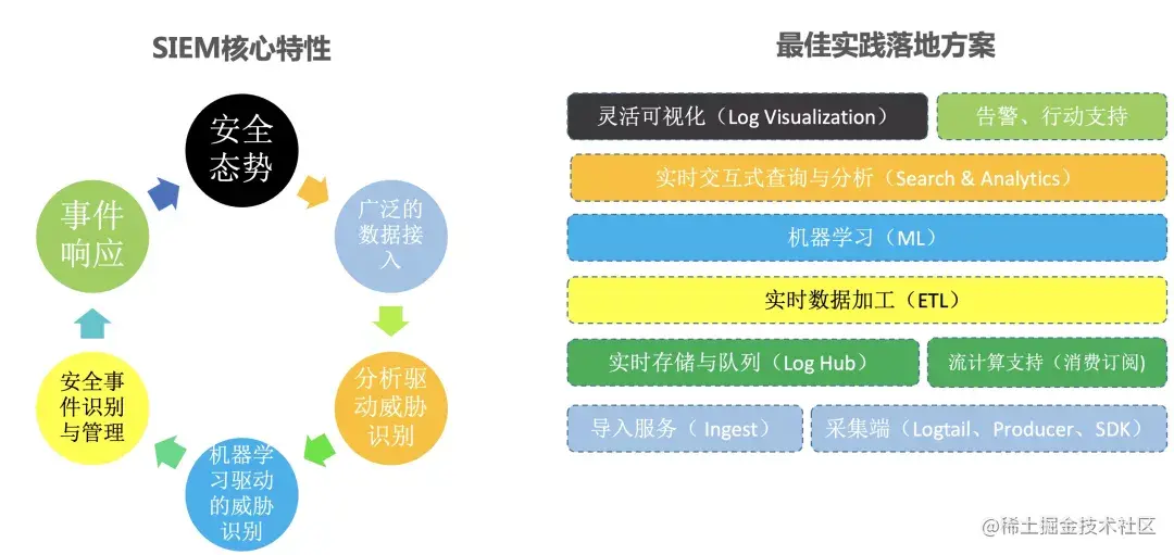基于上文提到的SIEM平台化的思路,我们可以看到SIEM系统一些核心的特性(左图),而右图是我们最佳实践的落地方案。