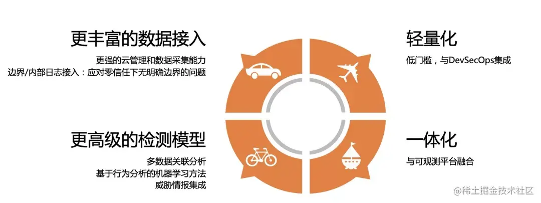 基于上述的趋势,我们可以看到零信任(从不信任,始终验证)理念、DevSecOps都给SIEM提出了新的发展要求。新一代的SIEM需要满足零信任下无边界持续动态监控的诉求,就需要监控更广泛的数据,并提供更强的关联分析能力。为了提升DevSecOps的效率,就需要做的更轻量,作为一个基础的工具与DevSecOps进行融合,提供更多开箱即用的功能。同时,与可观测平台一体化融合也是一个发展的趋势。