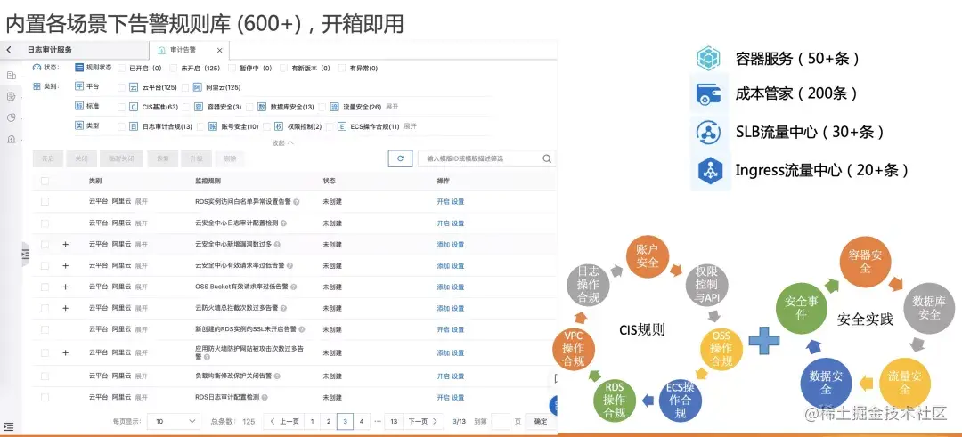 我们提供了超过数百个内置告警规则,开箱即用并持续增加中。这些规则库有覆盖了CIS(覆盖了账号安全、数据库安全等)和安全场景的最佳实践,用户仅需开启对应规则,即可享受到全天候的安全保障。