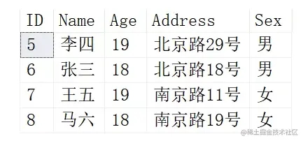 ( 5, '李四', 19, '北京路29号', '男' ),