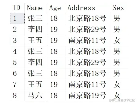 我们创建一个人员信息表并在里面插入一些重复的数据。