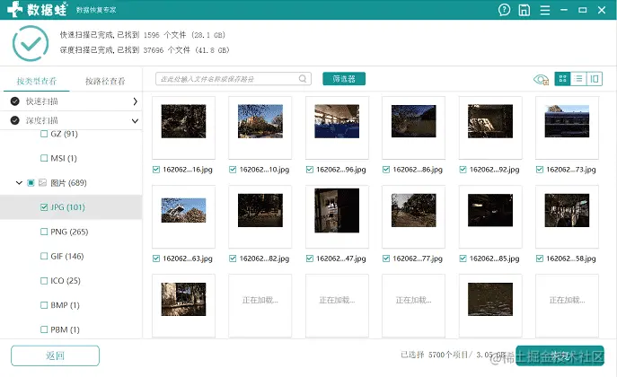步骤二:软件进入快速扫描阶段后,随着扫描进度,会扫描出很多丢失的图片,如果你在步骤一全选了文件类型,那么你就会扫描出更多丢失的文件。在左侧你可以通过文件类型和路径查看文件;将光标悬浮在文件名称上方可以查看包括文件路径在内的详细信息。完成快速扫描后点击上方的深度扫描,就会进入深度扫描模式,扫描更多文件。完成对截图的预览后,就能够进行数据恢复了。