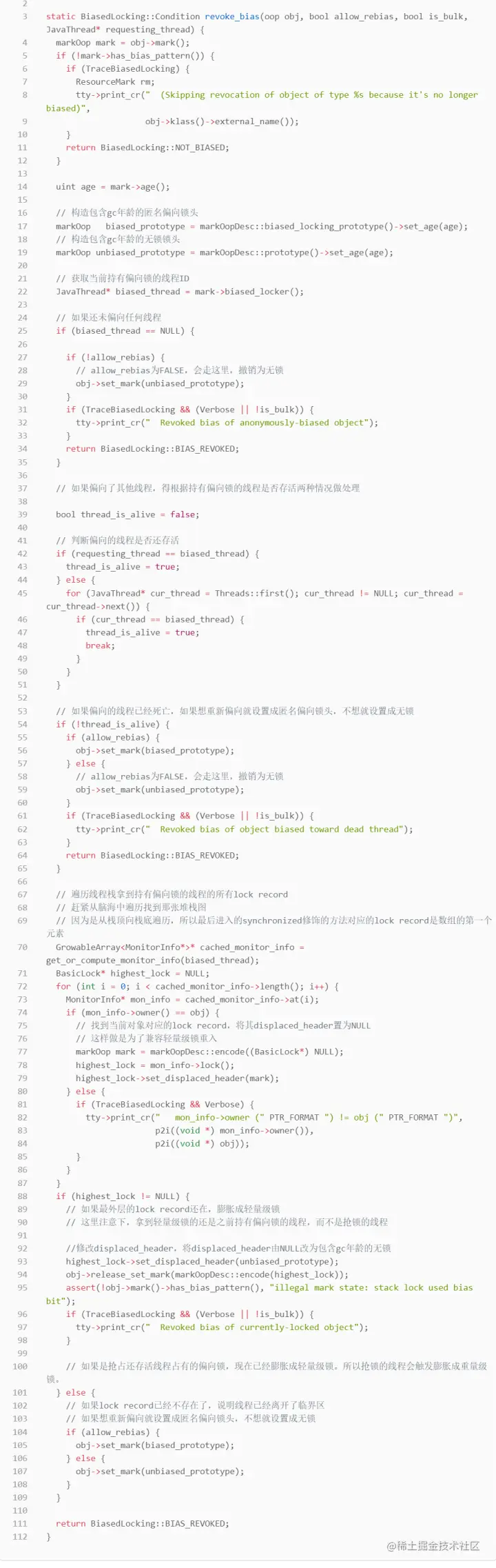 这个方法是理解偏向锁的核心方法之一,小伙伴们一定要多看多想多悟,悟透,不然学到后面一团糟。