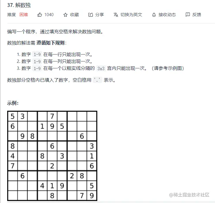 数独这道题主要就是递归和回溯比较麻烦,在做难题的时候一定要想好条件,把所有终止条件列好,比如这题就是三个终止条件:1、每行不能有重复的数字;2、每列不能有重复的数字;3、单独的3*3的小方格内不能有重复的数字。,然后再做验证方面的功能,最后再递归回溯检查一下没问题就可以了。