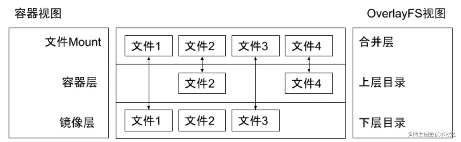 Overlay 只有两层:upper 层和 lower 层,Lower 层代表镜像层,upper 层代表容器可写层。