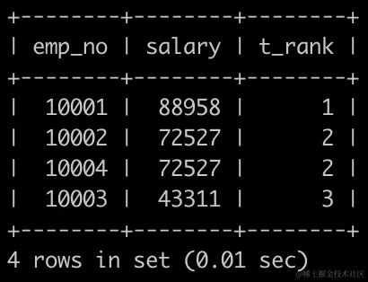 SELECT emp_no, salary, DENSE_RANK() OVER(ORDER BY salary DESC)