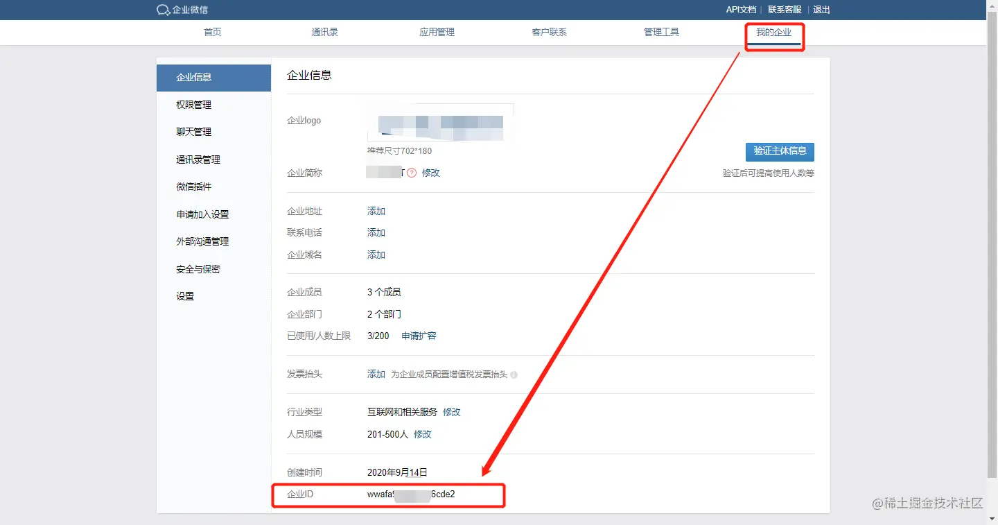注册完成之后,登录后台管理,在【我的企业】这里,先拿到后面用到的第一个配置:企业ID