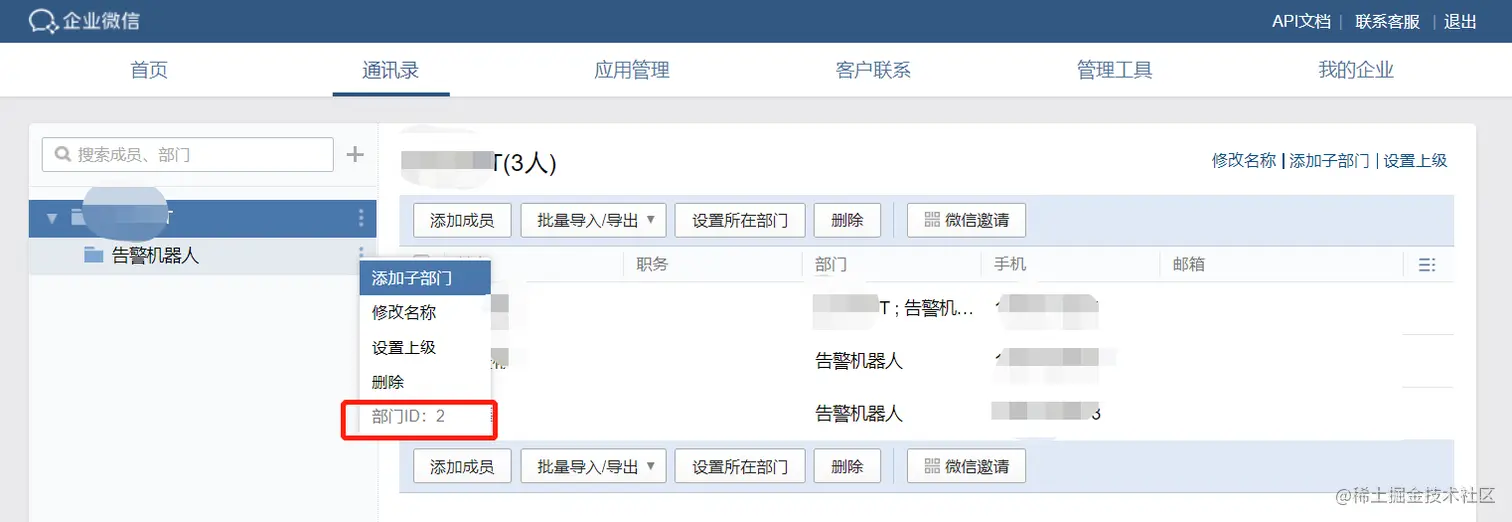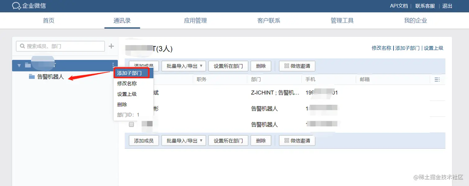 然后在通讯录中,添加一个子部门,用于接收告警信息,后面把人加到该部门,这个人就能接收到告警信息了。