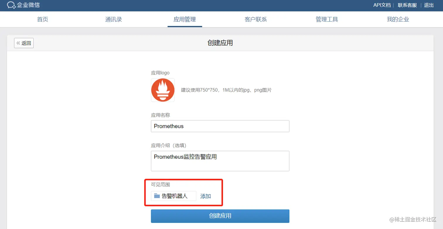 - 企业微信后台的配置,包括新建告警部门和应用;