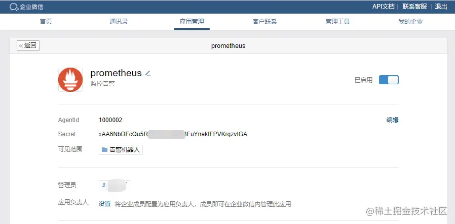以上步骤完成后,我们就得到了配置Alertmanager的所有信息,包括:企业ID,AgentId,Secret和接收告警的部门id