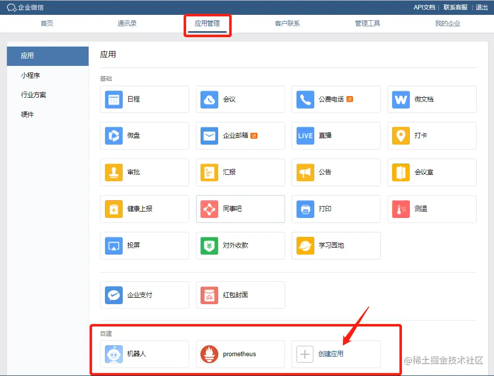 告警AgentId和Secret获取是需要在企业微信后台,【应用管理】中,自建应用才能够获得的。这里网上介绍的非常多,都只是说了这一步骤,而忽略了其他几个重要的步骤。