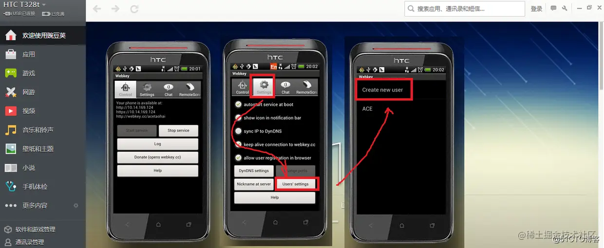 实用方法很简单,在手机上安装这个软件,然后运行,然后进入Setting,点击User's settings,然后Create new user(我新建了一个叫做ACE的用户),注意这里在豌豆荚的截图只是做教程用的,实际不需要连接豌豆荚,甚至不需要WIFI,只要你打开了GPRS
