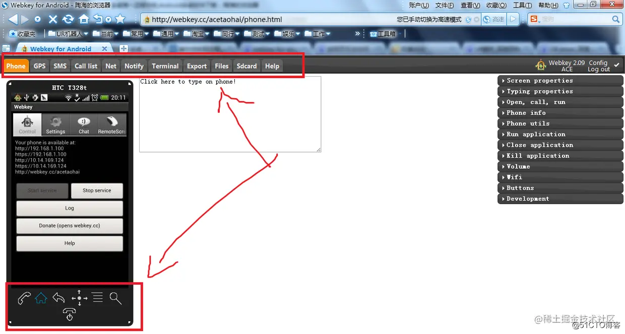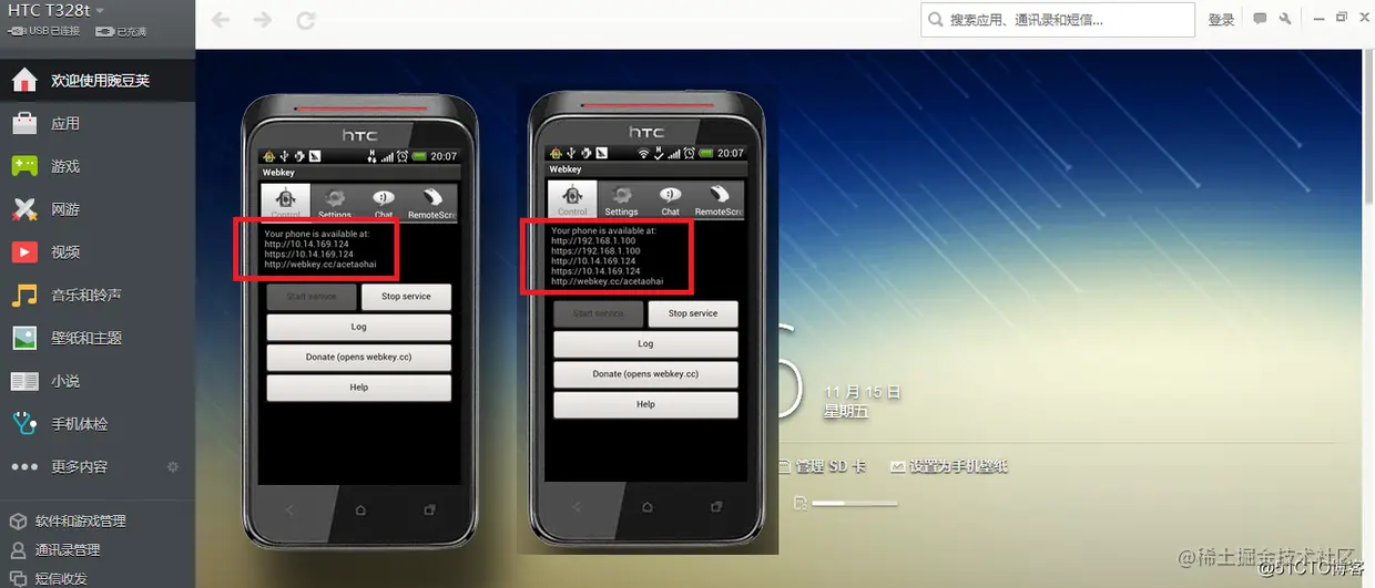 然后再Connect里面点击Start service,注意如果你没有开WIFI,则是下面左图,在浏览器中有三个地址可以访问。如果你连上了WIFI,则多了两个,最前面的192.168.1.100就是局域网的访问地址,用局域网的地址访问很快。当然如果仅仅是局域网,这个webkey就没意义了,局域网的控制软件到处都是,我们就是要真正的远程控制。