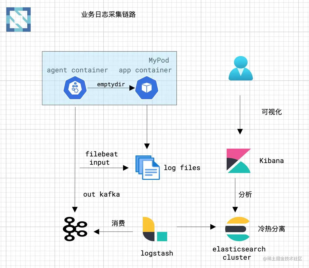 为尽量减少业务开发的改造成本,容器化需要尽快推广,并选择sidecar方式对业务日志进行采集,链路图如下: