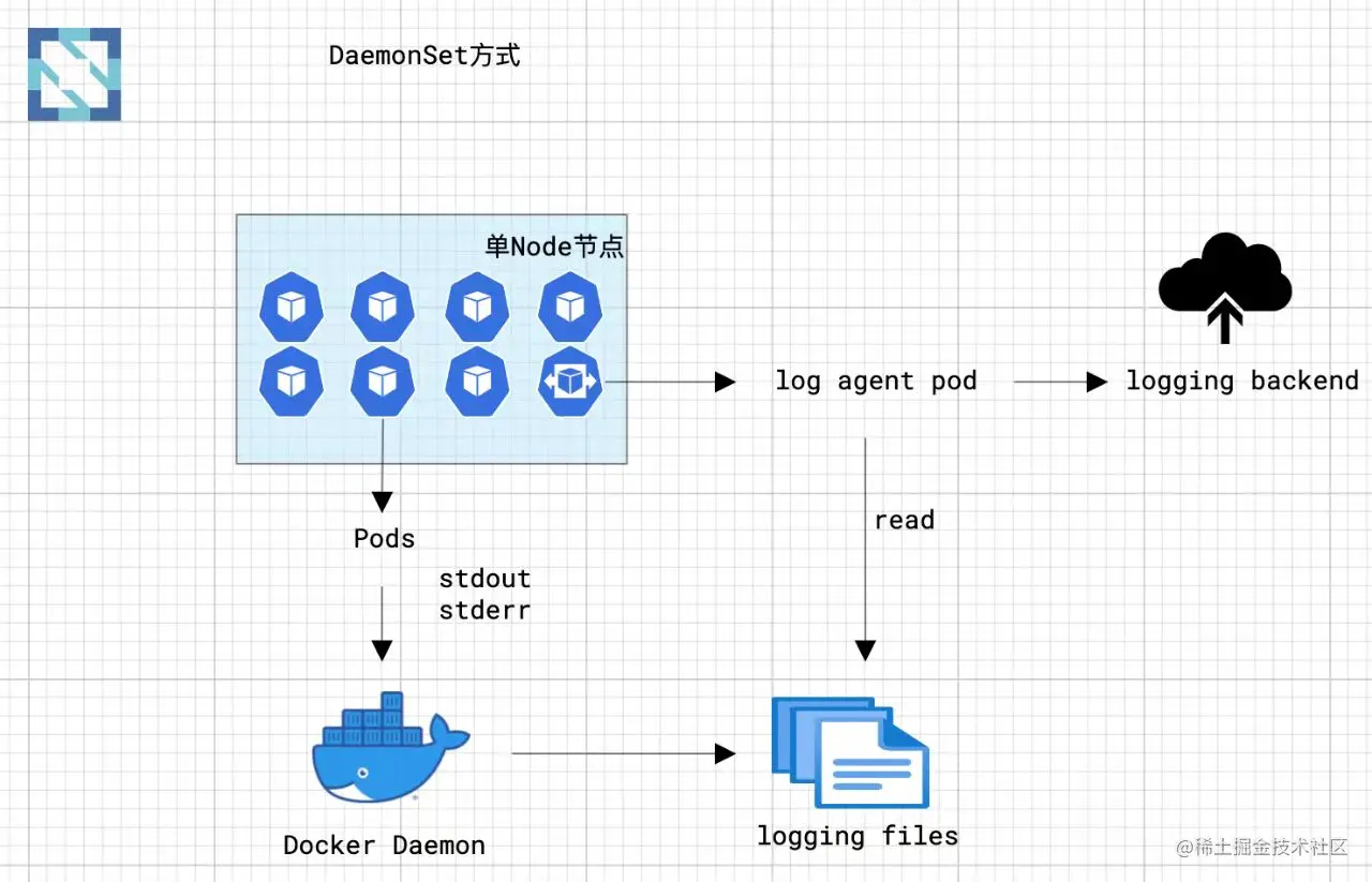 日志的采集方式分为被动采集和主动推送两种,在 K8S 中,被动采集一般分为 Sidecar 和 DaemonSet 两种方式,主动推送分为 DockerEngine 推送和业务直写两种方式: