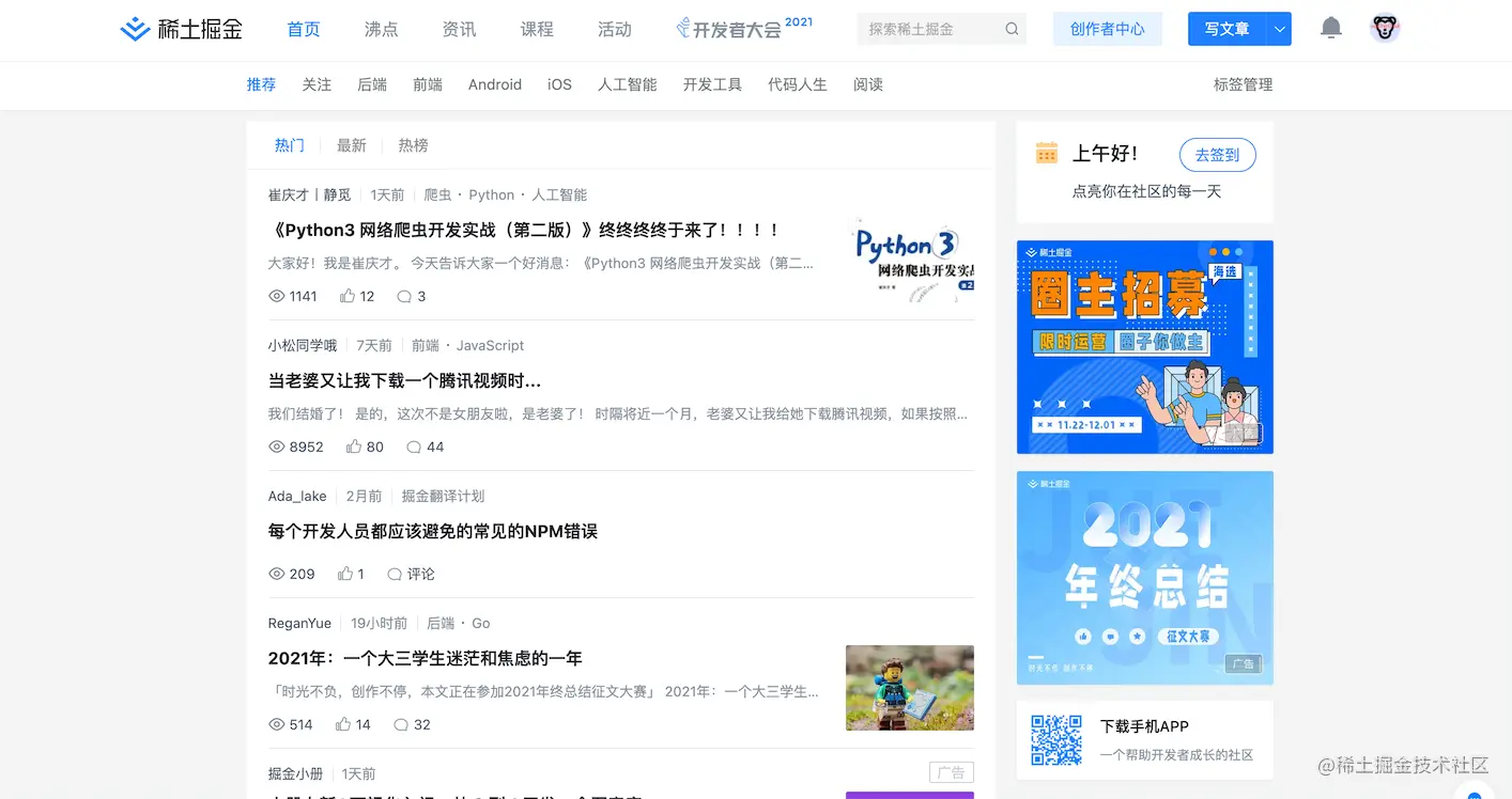 有沸点、话题、小册、活动、专栏文章等内容