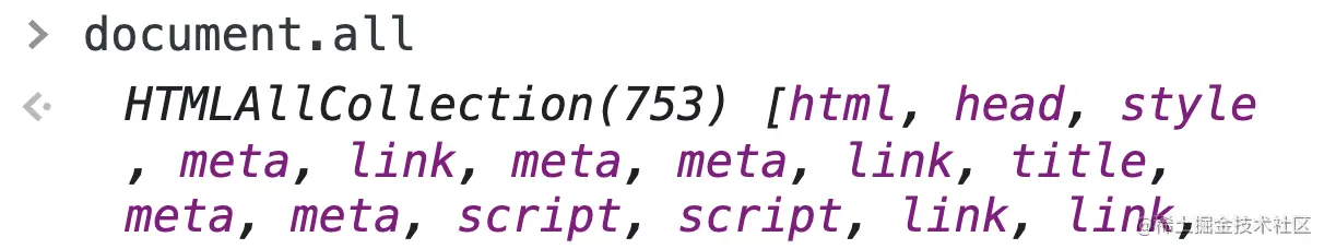 document.all会返回一个HTMLAllCollection集合,包含document下所有节点。可以理解为是一个包含页面中所有DOM节点的集合:
