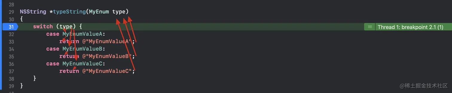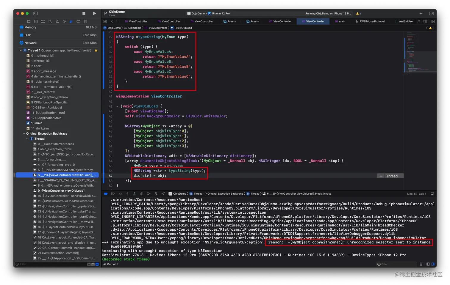 最近在开发过程中遇到一个崩溃。代码咋一看没啥问题,typeString 函数将枚举映射为文案。既没有警告,也没有错误,咋就崩溃了呢,而且还是给 MyObject 实例对象发了一个 copy 消息?