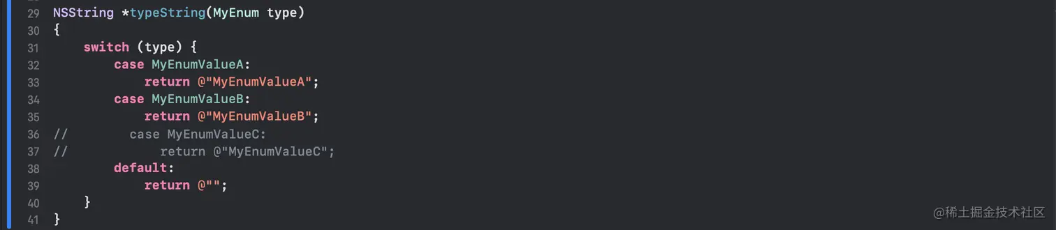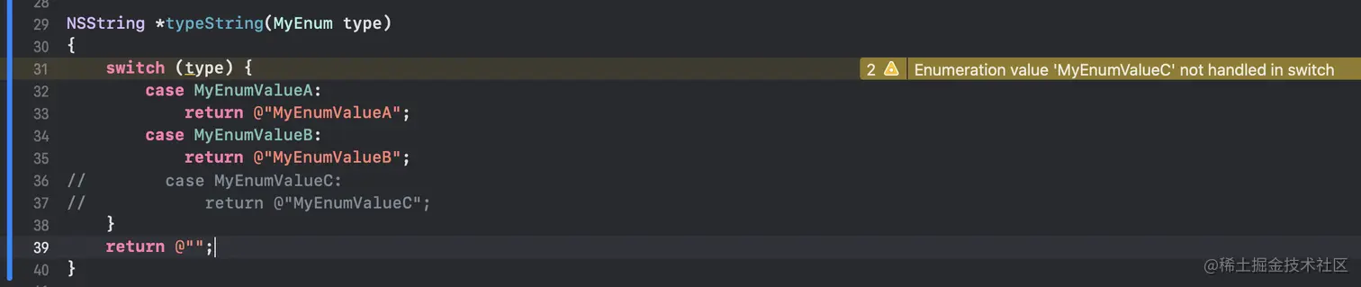 这里需要注意的是,OC 不同于 Swift,并不是一个强类型的语言。这里虽然定义的是 MyEnum 类型,但其本质还是 NSUInteger ,所以我们可以随意传入数字,而不是只能使用 MyEnum 中定义的类型,所以产生了纰漏。