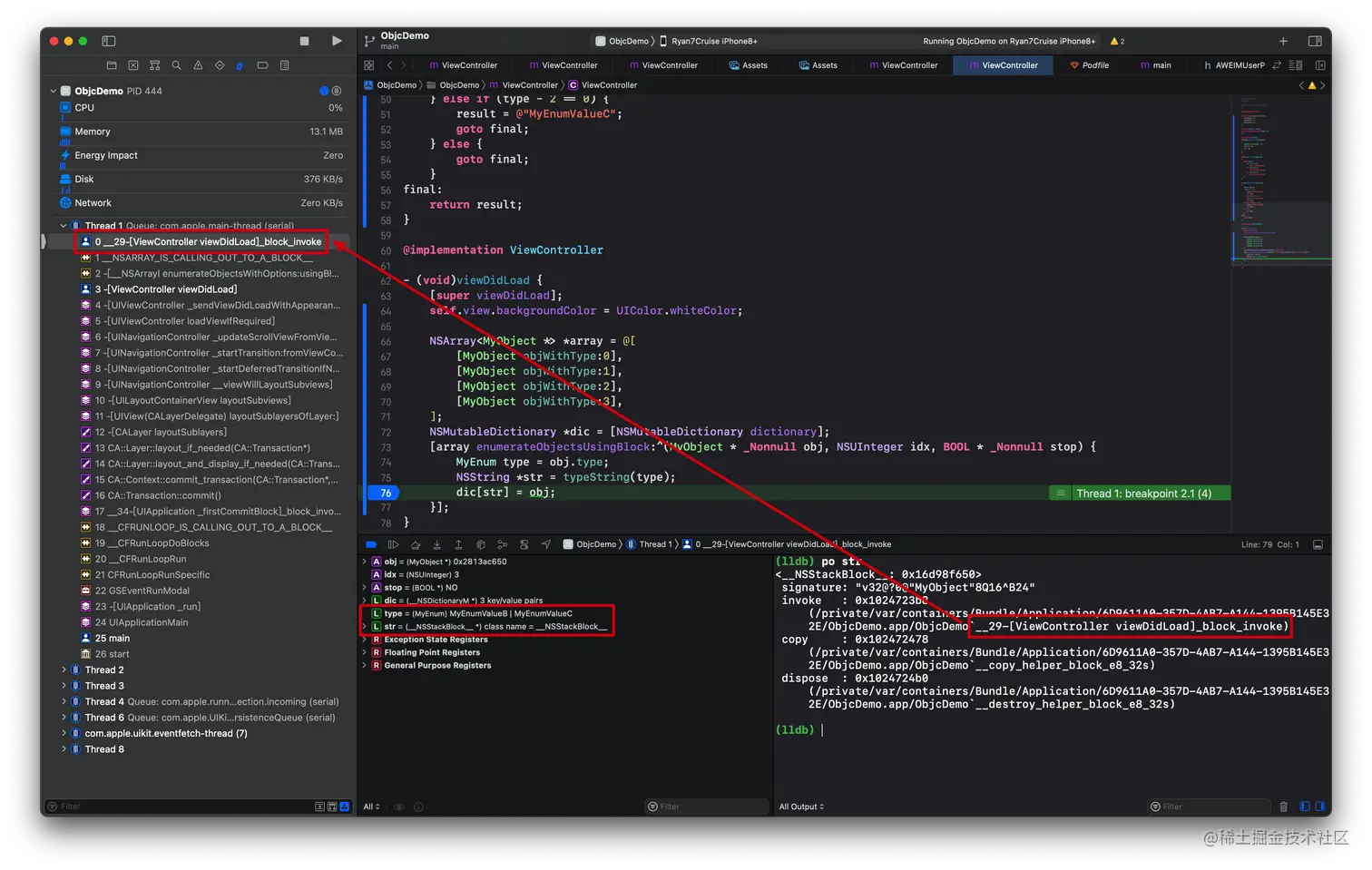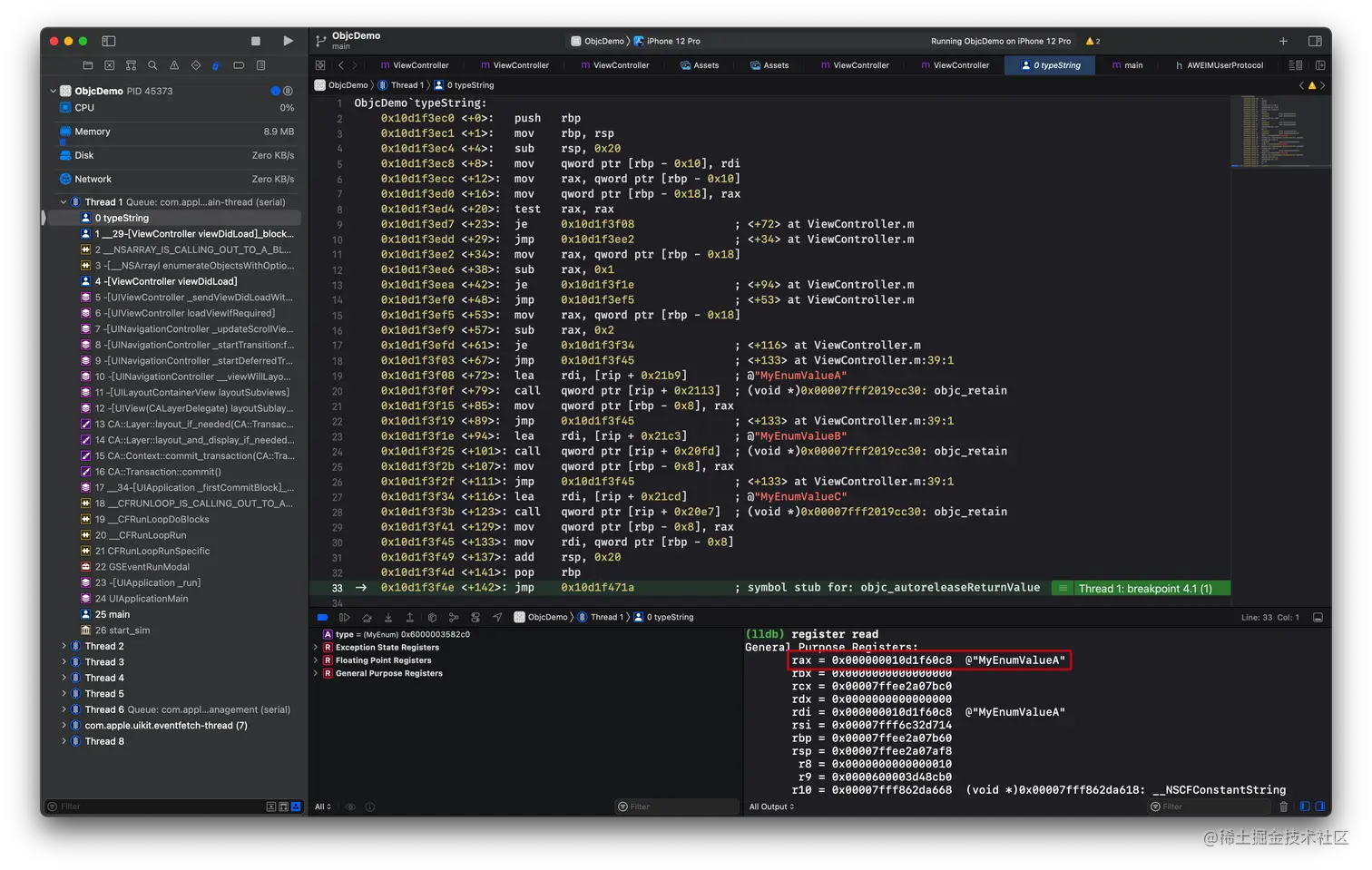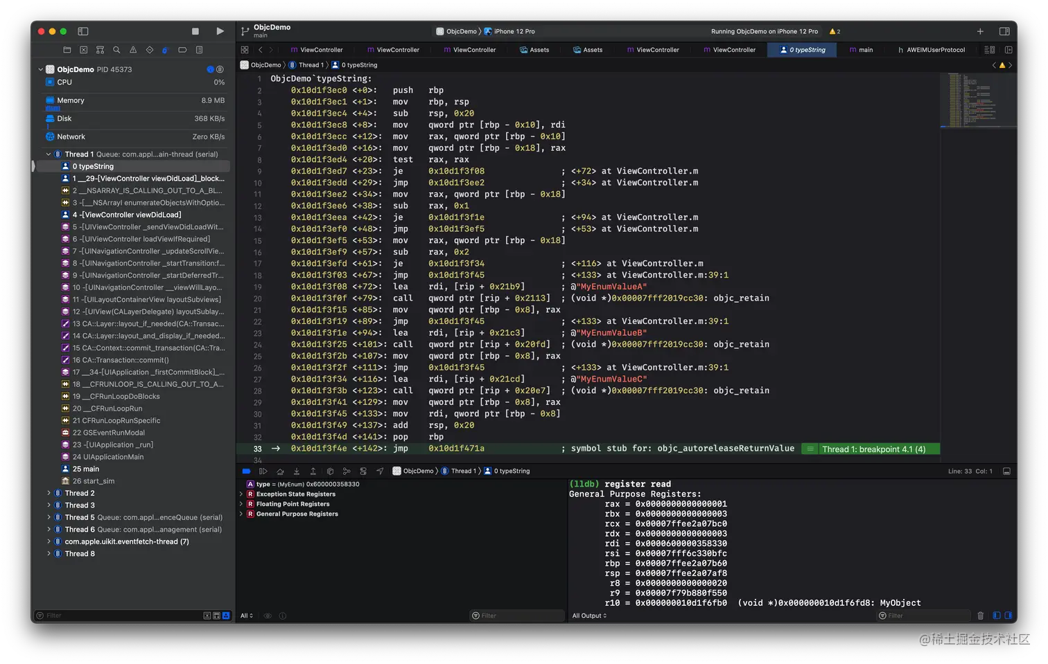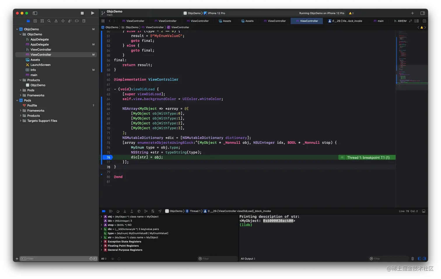 我们再在返回后设置一个断点,可以看到我们的临时变量指针指向的正是 0x6000030ac400,也就是我们的 MyObject 实例对象。