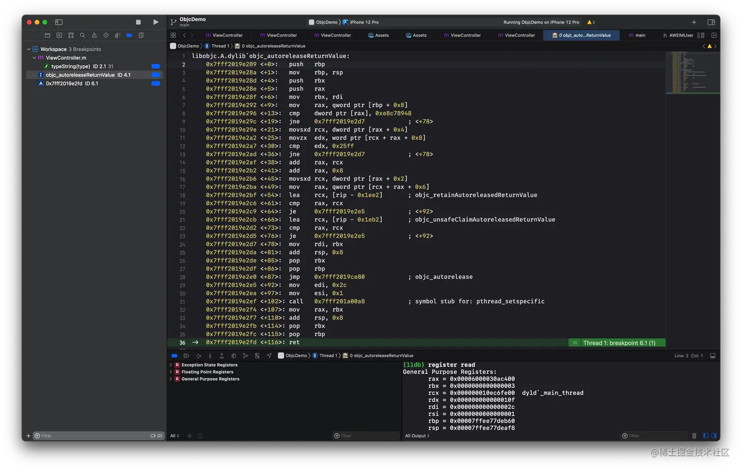 这里可以看到,还会调用一个 objc_autoreleaseReturnValue 方法。因为这里寄存器的状态不对,所以调用 objc_autoreleaseReturnValue 方法时,得到的结果就可能有问题。