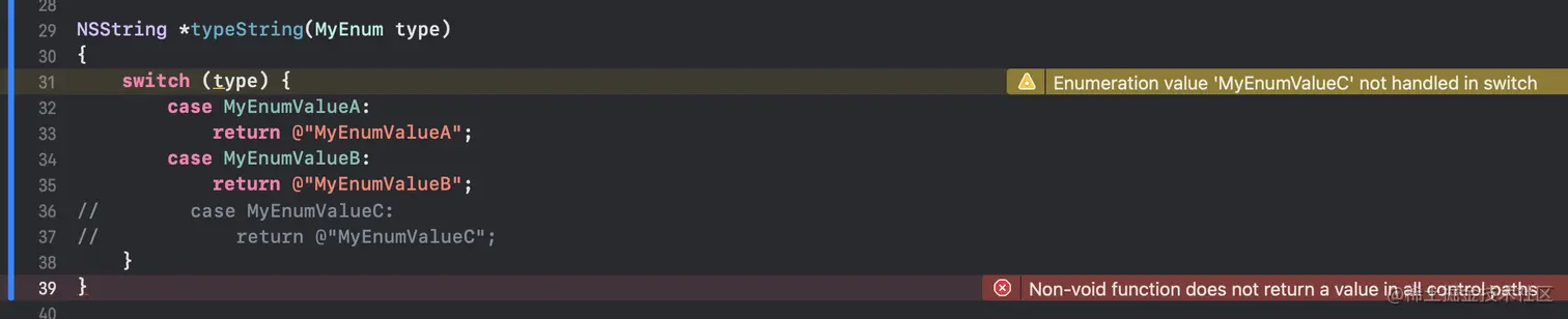其实,这里想利用编译器的一个机制。当我们新增一个枚举后,没有 switch 语句中没有覆盖所有 case 就会有警告,工程中又 treat warning as error 就会产生一个错误,可以很好地提醒修改代码的同学需要覆盖这些场景。