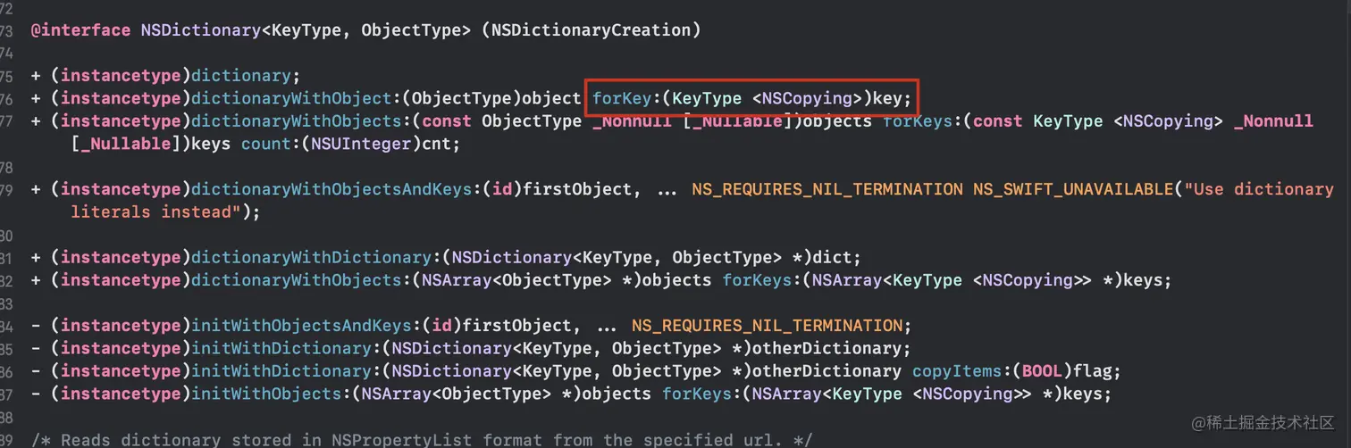 又因为 NSDictionary 的 key 是要求遵循 NSCopying 协议的,所以 dic[str] 这里触发了copy 操作,给 MyObject 实例对象发送了 -[MyObject copyWithZone:] 最终导致了崩溃。