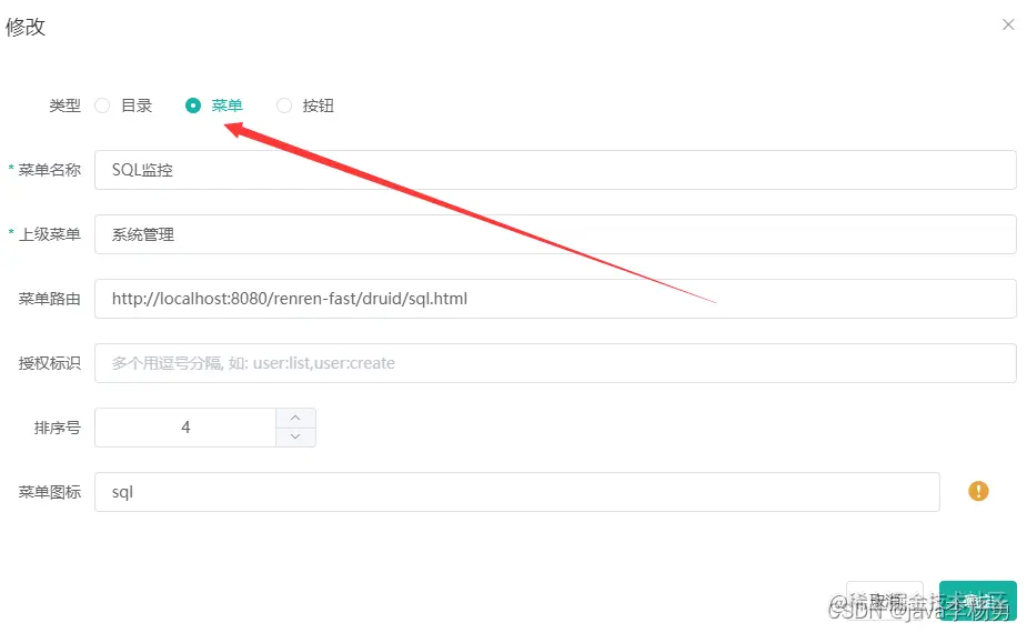 6 | type | int | 10 | 0 | Y | N | 类型 0:目录 1:菜单 2:按钮 | |