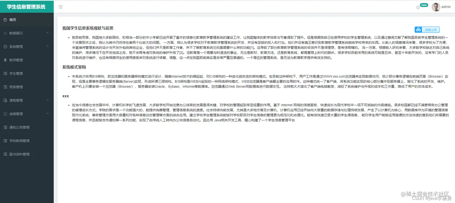 经过近期对Java 面向对象程序设计、前端知识以及Java框架的掌握和学习,以及这段时间本教育教学系统的开发,让我更加了解到 Java 学习的重要性。在开发这个系统时,我不仅进行了多次的试验,而且也对系统的功能进行了测试。在论文的实现过程当中,我从Java的认识到熟练运用注入了非常多的努力,到后面可以进行相关技术的运用也感到非常的开心。在这过程当中,我发现Java其实有非常之多的功能可以进行探索。Java同时具有封装性、抽象性、多态性以及继承性。可以对代码进行重复使用以及扩充使用,大幅度提高开发软件时的整体速度和效率。我作为教育技术学的学生,学好Java语言不管对我以后的就业还是现在的知识面的扩增都有着很重要的意义。我学习程序设计的主要目的就是提高自己实际问题的程序解决方案的关键技能和技术, Java 面向对象程序设计是一科实践性相对来说非常比较强的语言了、Springboot、SpringMVC框架的MVC三层架构模式、和框架中遇到的设计模式将数据访问和逻辑操作都集中到组件里面去了 , 增强了系统的复用性和扩展性。使系统的扩展性大大增强。以及前端VUE 、element、jQuery样式的掌握让我对网页的布局、样式调整、字体等让网页效果实现的更加精准。