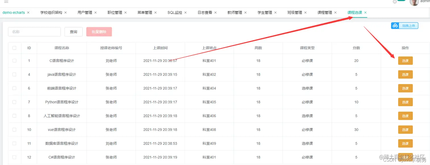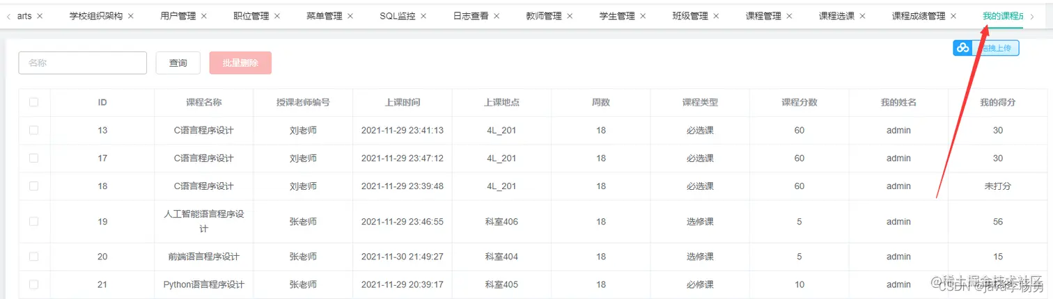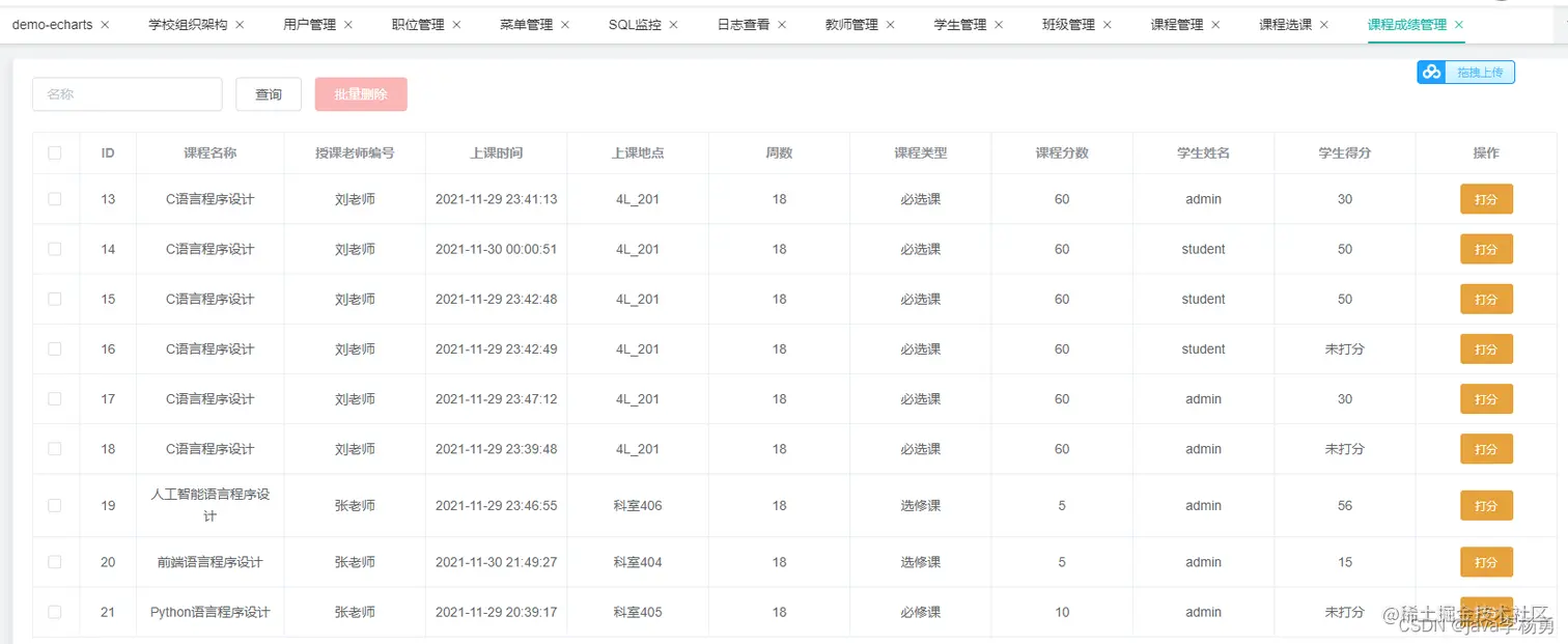 课程成绩打分:老师对选课的同学成绩进行打分。