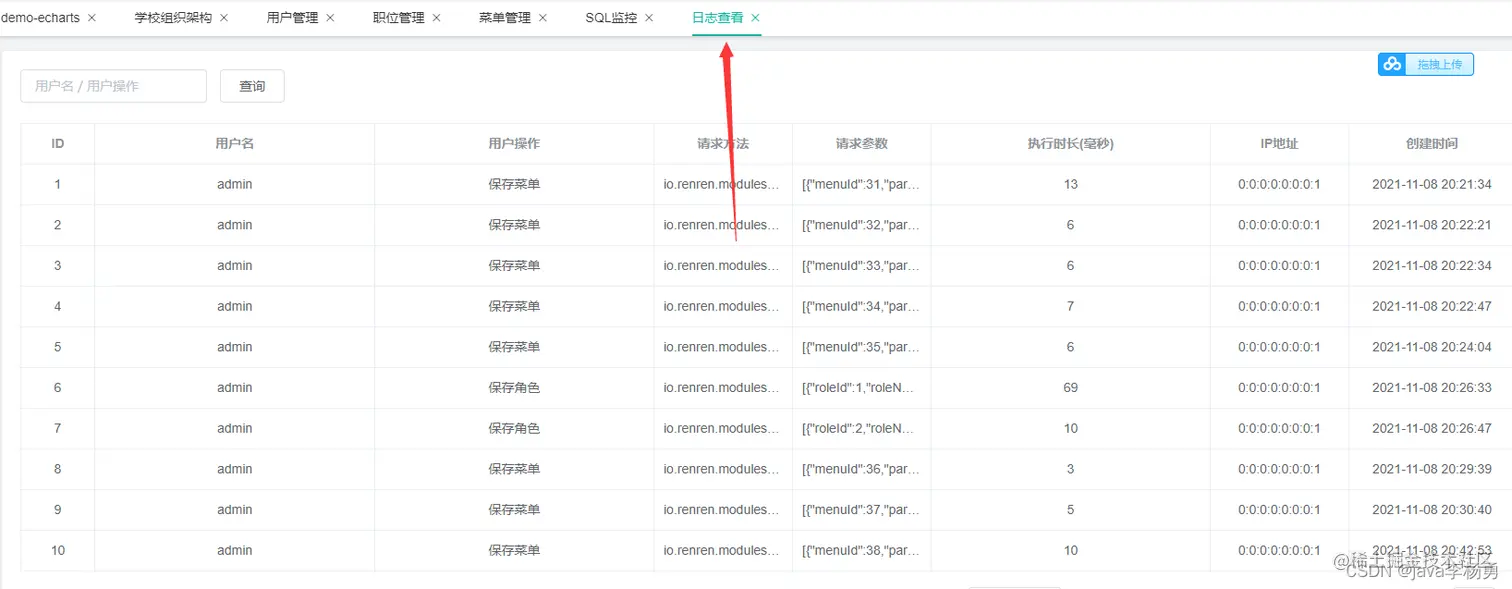 日志查询:AOP切面日志、绑定到controller层添加注解就行。