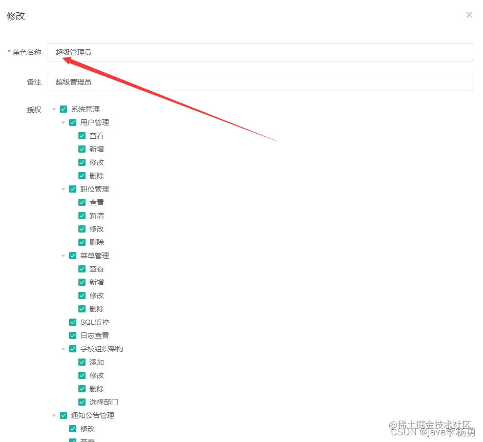 5 | perms | varchar | 500 | 0 | Y | N | 授权(多个用逗号分隔,如:user:list,user:create) | |