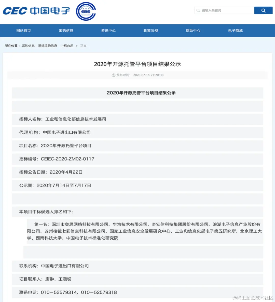 2020年7月,国家开源代码托管平台项目就已经开始投入建设,该项目由工信部领导,开源中国(深圳市奥思网络科技有限公司)牵头,联合国家工业信息安全发展研究中心、工信部第五研究所、电子技术标准化研究院、华为、奇安信、浪潮电子、苏州棱镜七彩公司、北京理工大学、西南科技大学共同实施,以开源中国Gitee为基础,建立我国高水平、高性能、安全可靠的开源托管平台。