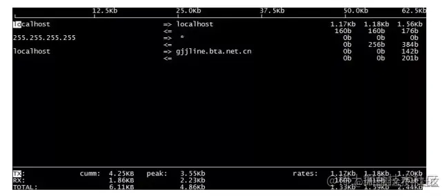 [root@localhost iftop-0.17]# iftop [root@localhost iftop-0.17]# iftop -i eth0 #指定监控网卡接口