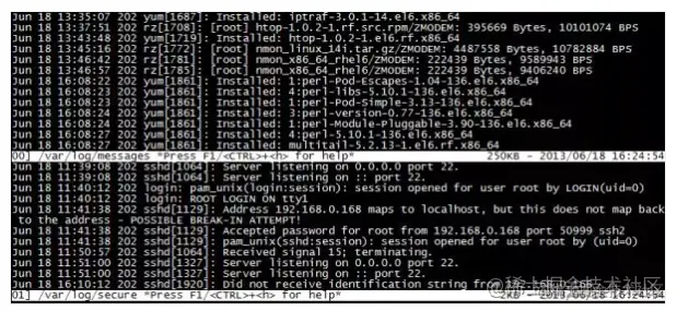 [root@localhost ~]# multitail -i /var/log/messages -i /var/log/secure #-i指定一个文件名