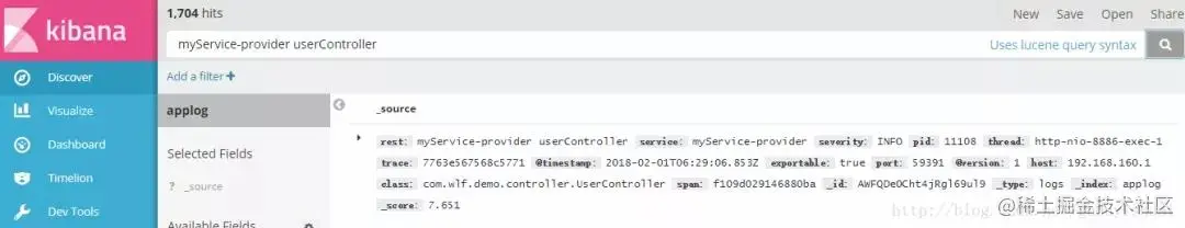 我们看到日志信息在rest字段中。另外,通过trace和span还可以跟踪到整个微服务的调用过程。到此为止,整个日志采集就搭建完成了。系统上线后只需要在elasticsearch中就能搜索到各个服务器上,各个微服务的日志内容了。