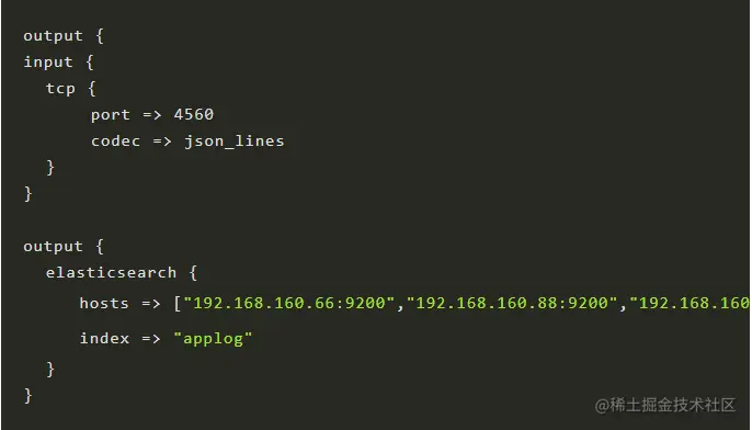 其中port为端口号,codec表示通过json格式,elasticsearch.hosts表示elasticsearch的地址,这里是集群。index 为日志存储的elasticsearch索引。