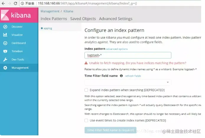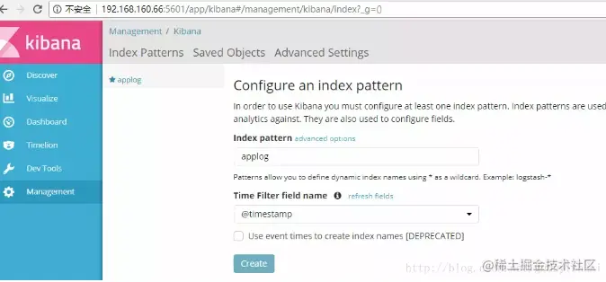 将applog配置到kibana中,在index pattern中输入我们的applog索引