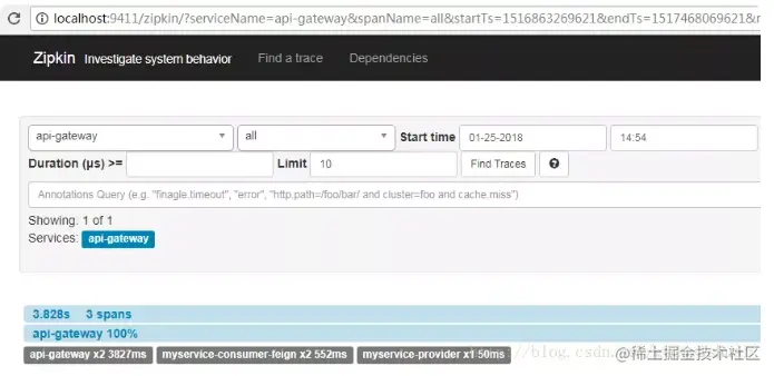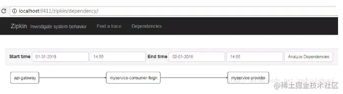 同样我们也可以看到微服务之间的依赖关系,这里是通过网关调用了myservice-consumer-feign微服务,然后通过myservice-consumer-feign微服务调用了myservice-provider微服务