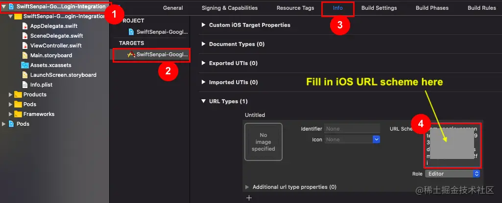 Google Sign-in需要加一个定制的URL Scheme到项目。根据如图所示的步骤,把刚刚创建的OS URL scheme添加到 iOS URL scheme(下图标记4的位置)。\
