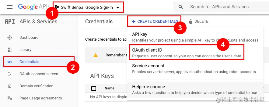 Once finished configuring the OAuth consent screen, it is time to create the OAuth client ID. You can follow the steps as shown in the image below to navigate to the OAuth client ID creation page.