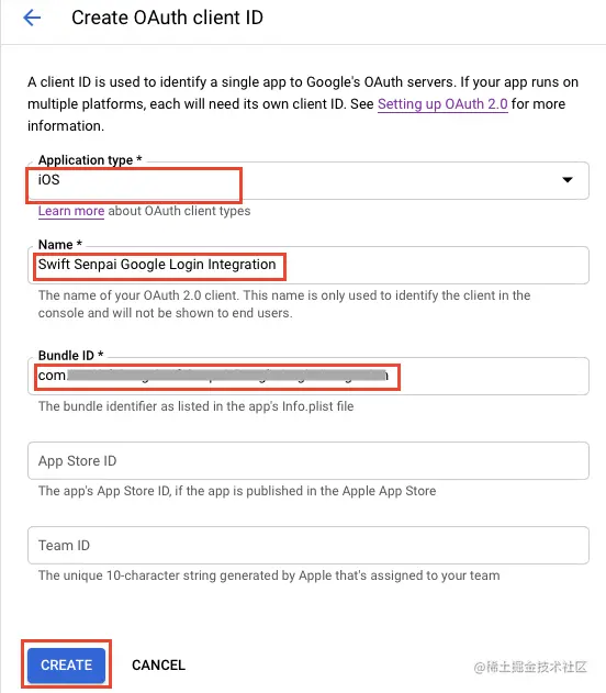 在接下来,在 OAuth client ID创建页面,选择“iOS”作为Application type,填写一个名字并填写你app的bundle ID,然后点击创建。