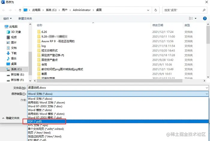 第三步: 在弹出的保存框中,找到”保存类型“,点击右侧的下拉框,找到”PDF“,最终完成WORD文档转为PDF文件的操作。