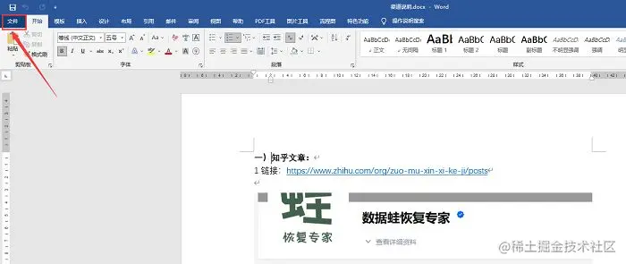 第一步: 打开需要转为PDF文件的Word文件。之后点击左上角的“文件”选项。