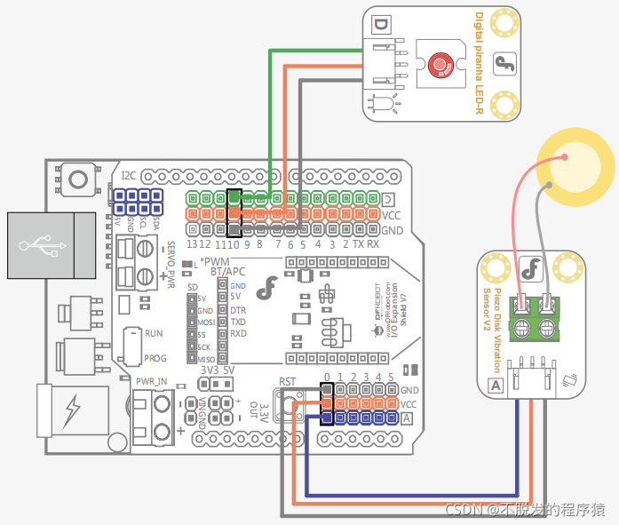 本项目将使用到模拟压电陶瓷震动传感器,简单的说,就是检测震动的传感器,原理就是:利用压电陶瓷给电信号产生震动的反变换过程,当压电陶瓷片震动时就会产生电信号,与Arduino专用传感器扩展板结合使用,Arduino模拟口能感知微弱的震动电信号,来实现灯光变化。