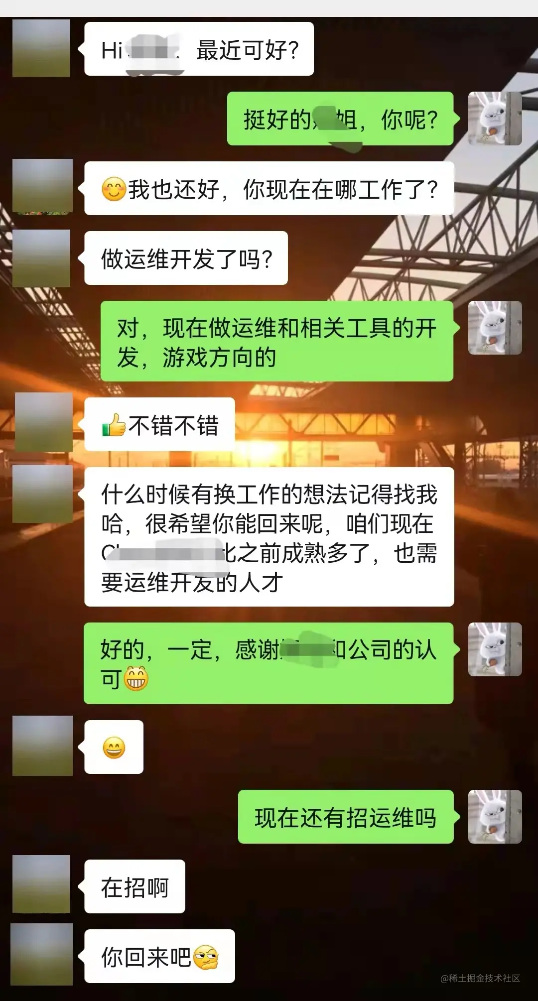 努力能给人带来好运。 经历了过往种种,我想一个人能有好事砸在你的头上,或者遇到问题最终能得到解决,除了运气的因素,主要还是因为你够努力,你已经准备好了。职场和生活中都需要经营,学着做工作中的好同事,生活中的好朋友。我自己不是一个聪明的人,但还算是一个比较努力的人,靠谱的人,拿之前待过的公司来讲,后来都有找过我,希望我能回去,我感觉这是对我最大的认可,全文都没有配图,那就在图片中结尾吧。。。。