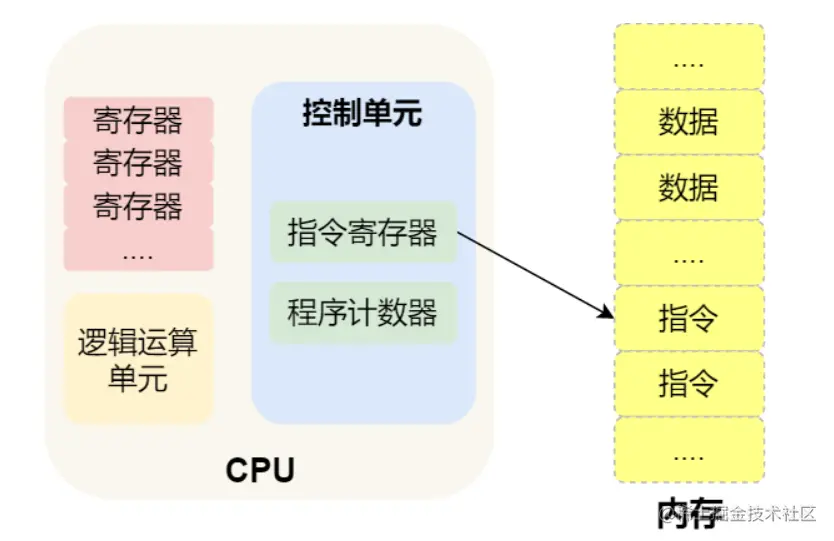 2. cpu分析【指令寄存器】中的指令,确定指令的类型和参数,如果是计算类型的指令,就把指令交给【逻辑运算单元】运算,如果是存储类型的指令,则交由【控制单元】执行;